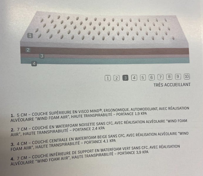 Le matelas Cortona combine le Memory viscoélastique, le Waterfoam et le Bio Memory pour un soutien optimal et une relaxation musculaire complète. Son confort souple et rebondissant, associé à une excellente respirabilité grâce aux alvéoles, assure une nuit de sommeil agréable. Il est entièrement déhoussable.